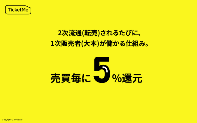 チケミー内のマーケットプレイスで二次流通された場合、額面の5%が一次販売者に還元される仕組みとなっております。そのため、二次流通が起これば起こるほどより多くの金額を手に入れることができます。