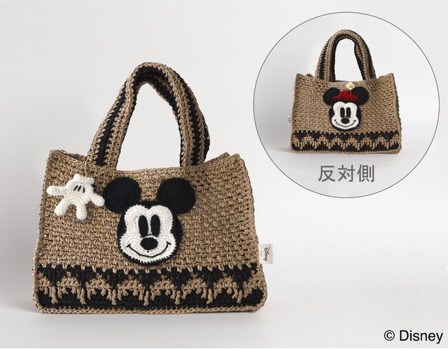 ナチュラルな色の夏糸で編む、かわいいサマーバッグ。模様編みのマチつきバッグの前後には、ミッキーとミニーをアップリケします。手袋のチャームがポイント。