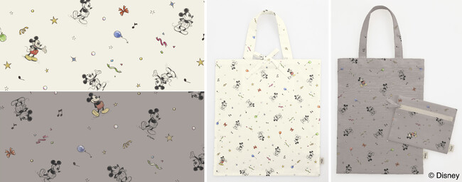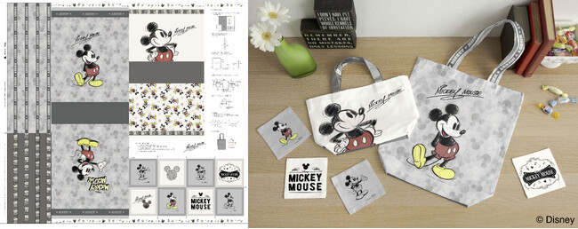 スケッチ風ミッキーマウスの生地を2柄発売。品のあるアイボリーとグレー地で用意した総柄は、カラフルなミッキーマウスが紛れ込んでいる遊び心のある生地です。パネルクロスは、ほどよい厚みの生地に印刷された案内線に沿って裁断し縫い合わせるだけで、オリジナルのバッグ2個とコースターが作ることが出来ます。