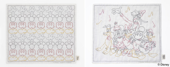 ミッキーのアイコンを並べた図柄と、ミッキーたちの楽しそうなシーンを刺し子に落とし込みました。水に通すと薄くなる線が印刷された品質の良いさらし布は針運びがさくさくと進み、手芸を気軽に始められるアイテムです。