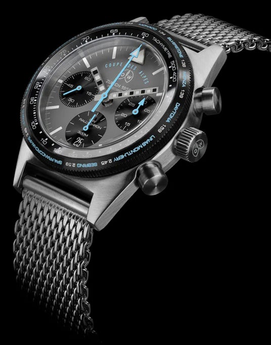 オレッヒ&ワイス(O&W)のRallychron(ラリークロン)/Rallychron CA(ラリークロン CA)は、1960年代のカーレース黄金期をリスペクトして発売されました。もっとも特徴的なのはモチーフにチェッカーフラッグを引用したインパクトあるバーダイアル。加えて数々のドラマを創り出した11ヶ所のサーキットでの「理論上の最速ラップタイム」を刻みつけた回転ベゼル。遊び心溢れたデザインですが、そのベゼルの内周にはタキメーターが配置され、O&Wの機能を重視した姿勢に抜かりはありません。