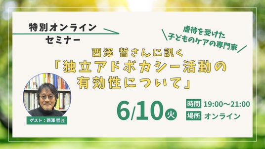 NPO法人全国子どもアドボカシー協議会(所在地:福岡県福岡市城南区、理事長:相澤 仁)は、2025年6月10日(火)に特別オンラインセミナー『西澤哲さんに訊く「独立アドボカシー活動の有効性について」』を開催いたします。本セミナーでは、講師に虐待を受けた子どものケアの専門家である西澤 哲先生(山梨県立大学 特任教授)、進行役には長年にわたり子どもや福祉の現場を見つめてこられた大久保真紀さん(朝日新聞)をお迎えして、子どもが自分の意思で語ることができる状態や環境をつくるために必要なことについて話を伺います。参加者の皆さんとともに、子どもアドボカシー活動が効果的に機能するためのあり方について考える時間にしたいと思います。