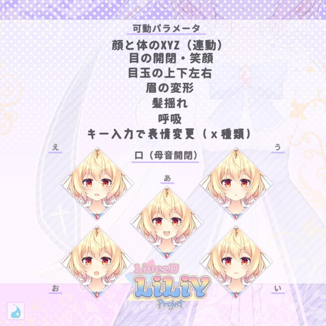 『リリ・リファール』(LiLiY)は、配信活動などにご利用いただけるオリジナルのLive2Dモデルです。