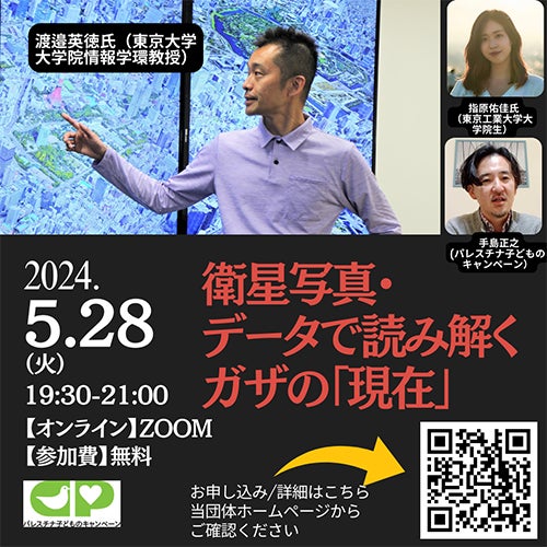 NPO法人パレスチナ子どものキャンペーンは、衛星写真を使って、ガザ破壊状況について分析している渡邉英徳氏(東京大学大学院情報学環教授)のお話、ガザの最新の状況、支援活動について、オンライン開催します。