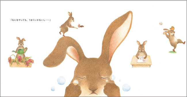 以前のモグラちゃんのように「何をやってもうまくいかない」と悩んで泣き出したウサギちゃん。モグラちゃんはそんなウサギちゃんを励まします。そして、モグラちゃんのおばあちゃんがおしえてくれた「おまじない」をウサギちゃんにそっと教えてあげるのです……。
