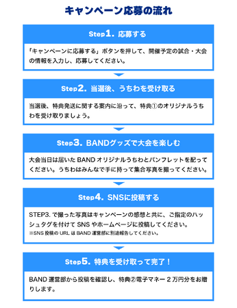 今回は、7月から9月にかけて、開催を計画している大会・試合を応援したく、現場で使えるBANDオリジナルうちわを参加者全員にプレゼントするのと、さらにチームで使える2万円相当の電子マネーをサポートします。たくさんのご応募お待ちしております。