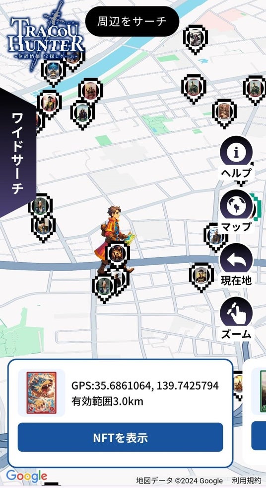 「トレクーハンターTRACOU HUNTER」は、トレーディングカード要素を組み合わせ、GPSを活用し、現実空間の位置情報をトリガーにNFTトレカ型クーポンの「トレクー」が受け取れる、宝探し感覚のデジタルマップサービスです。