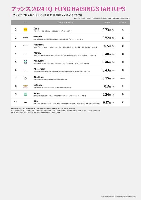タイトル:フランススタートアップ資金調達額ランキングTOP10(2024年 1Q)