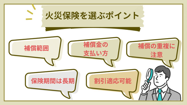 加入する火災保険選びで意識するべきポイントは、下記の5つです。