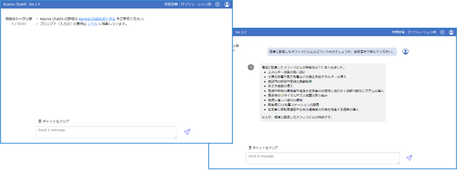 鹿島(社長:天野裕正)は、自社専用の対話型AI「Kajima ChatAI」を構築し、自社および国内外のグループ会社(一部を除く)の従業員約2万人を対象に運用を開始しました。「Kajima ChatAI」は、日本マイクロソフト株式会社(本社:東京都港区)のAzure OpenAI Serviceを活用し、ChatGPTと同等のAIモデルを社内に構築したものです。これにより、入力した情報が外部の学習に利用されない鹿島グループ専用の安全な環境となっています。