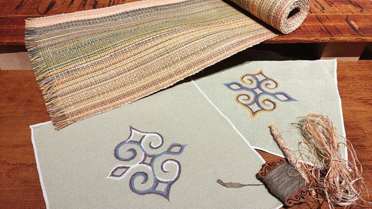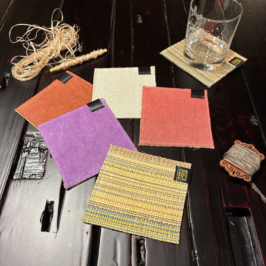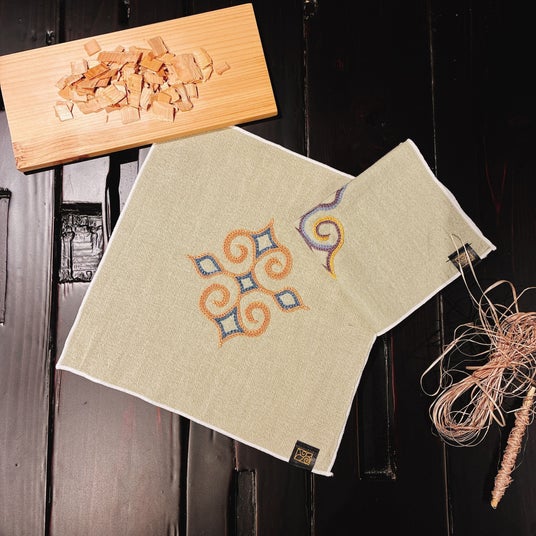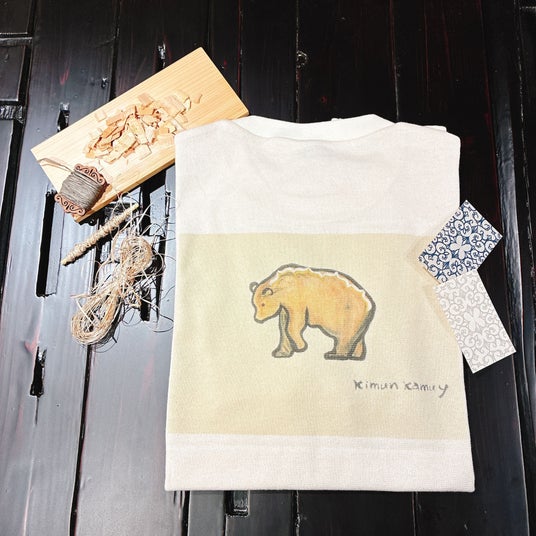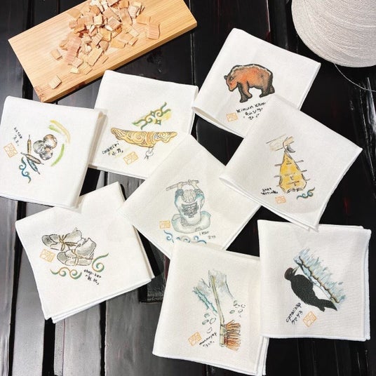 こうしたアイヌの手仕事に共感したのが、一般社団法人アップサイクルが推進する使用後の紙資源や間伐材を紙糸にアップサイクルプロジェクト「TSUMUGI」です。資源を無駄にせず、再利用しながらも価値を高めていくことをテーマにコラボレーション製品を開発しました。タテ糸にアットゥㇱ、ヨコ糸にTSUMUGI の紙糸を用いて伝統的なアットゥㇱ織の技法で織りあげた名古屋八寸帯やコースター・ファブリックパネルをはじめ、アイヌで魔除けといわれるヨモギで染めたTSUMUGI の生地にアイヌ刺繍をあしらったハンカチ、またアイヌ工芸作家・関根真紀描き下ろしのアイヌ紋様と民具イラストを配したT シャツやハンカチなど、現代のアップサイクル技術とアイヌの伝統技法が織りなすものづくりが生まれました。