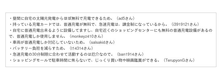 自宅充電のほか、プランや施設によって無料で充電できるから利用しているという声も多くありました。