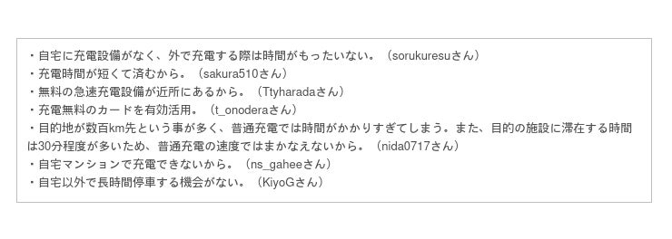 多い回答は「普通充電は時間がかかるから」。普通充電同様、無料の施設があるからという回答もありました。