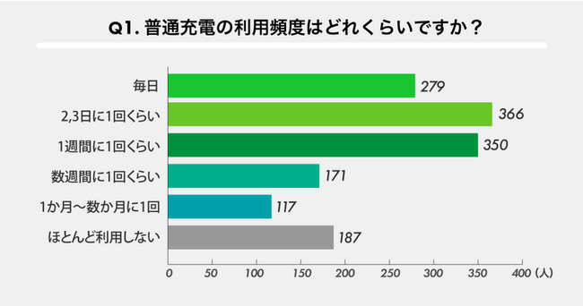 最も多い回答は「2,3日に1回くらい」で25%で、僅差で「1週間に1回くらい」が24%、「毎日」が19%となり、約1割の方は普通充電を「ほとんど利用しない」と回答しました。7割近くの方は週に1度以上普通充電を利用していることが分かりました。