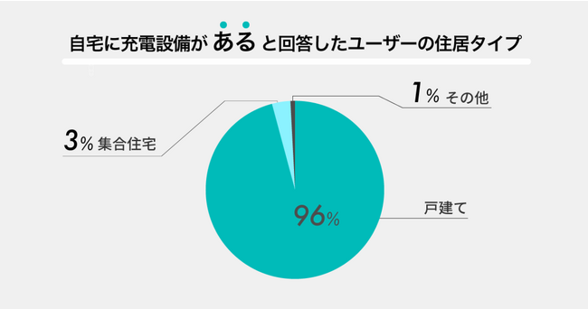 自宅に充電設備がある方の96%が戸建てに住んでいると回答。集合住宅に住んでいると回答したユーザーはわずか3%でした。
