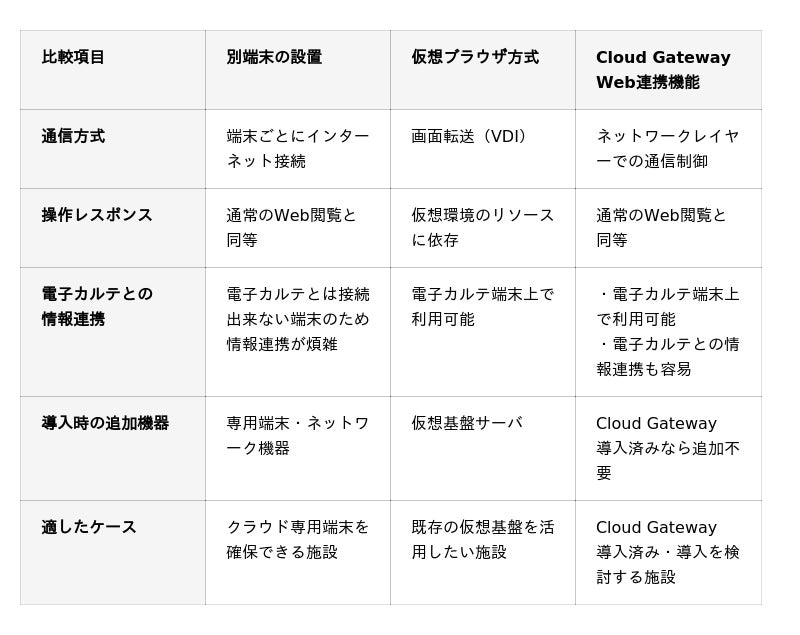 そのため、クラウド型の業務支援サービスを利用するには、電子カルテ端末とは別の端末を用意する方法や、仮想ブラウザを経由する方法など、各施設の環境に合わせた接続手段が取られてきました。