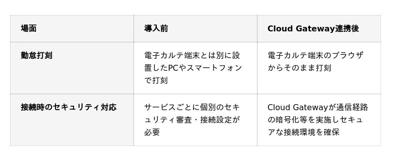 閉域網の電子カルテ端末からCloud Gatewayのセキュアな通信経路を通じてDr.JOYにアクセスできます。電子カルテで患者情報を確認しながら、同じ端末上でDr.JOYの勤怠管理(出退勤打刻・申請・承認)を利用でき、端末を切り替えることなくシームレスな業務が実現します。