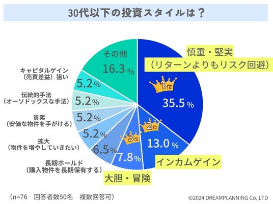 その中で、30代以下の投資家については「大胆・冒険」が3位にランクイン。不動産投資は取引金額が大きいため、大きなリターンを狙いたい方も算入しているためでしょう。