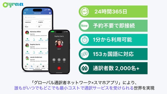 『Oyraa』は、153言語2,700名以上の通訳者を、24時間365日いつでも予約不要でスマホから呼び出し、1分単位でサポートを受けることができる通訳アプリです。主に母国外の国で生活をする人々が活用する通訳サービスとして、ビジネスの現場から生活に根付いたニーズにまつわる言語サポートまで、幅広くご利用いただいております。スマホやタブレットさえあればどこでも『Oyraa』を利用できるため、役所手続きや医療機関受診、電話での問い合わせといった日常生活におけるあらゆるシーンで通訳者による言語サポートを受けることができます。121の専門分野の中からプロ通訳者を選択でき、高品質な通訳をリーズナブルな価格で利用できることを実現しており、外国語コミュニケーションを行うすべての人にご利用いただけるサービスとなっています。日本では2040年には在留外国人が1,000万人を超える見通しですが、Oyraaは日本に住み始めて日が浅く日本語が堪能でない外国人の方の生活支援を行うことができる数少ない通訳サービスです。