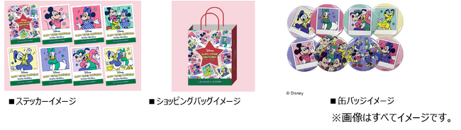 期間中、対象店舗にて対象商品もしくは、ディズニー関連商品をお買い上げいただいた方に、本キャンペーン限定ステッカーをプレゼント。さらに、先行限定販売商品をお買い上げの方には、ショッピングバッグと缶バッジもプレゼントいたします。本キャンペーンでしか手に入らない限定グッズです。