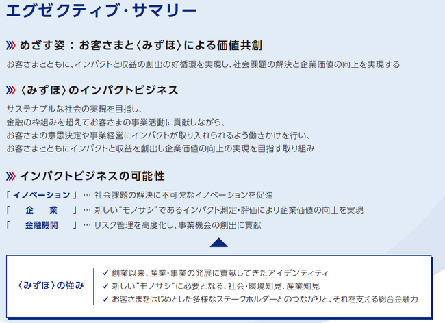 〈みずほ〉のインパクトビジネスとは、1.サステナブルな社会の実現を目指し、金融と金融を超えたサービスの両面でお客さまの事業活動に貢献する、2.お客さまとの多様な価値共創を通じて意図をもってインパクトを創出する、そして、3.インパクトと収益の創出の好循環の実現と金融資本市場の活用を通じたお客さまの企業価値向上の実現に貢献する取り組みです。