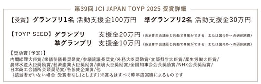 厳正なる審査の上、受賞者の方々には受賞イベントの参加やメディア露出、フォーラムでの講演など活動の域を広げる機会を提供し、さらに受賞者の中から日本代表候補者として2026年の「JCI TOYP」に申請をいたします。