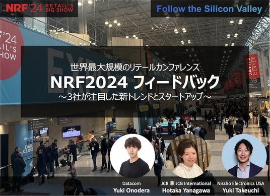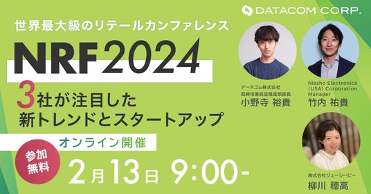 米国時間で 1月15日から17日にかけて小売業界のビッグイベントである「NRF 2024」がニューヨークで開催されました。今回は100カ国以上から約40,000人が参加し、小売業界のキーマンや、小売業者のサポート企業として第一線で活躍している方が講演を行いました。 今回のウェビナーでは、NISSHO ELECTRONICS(U.S.A.)CORPORATION(以下:NISSHO ELECTRONICS USA)、株式会社ジェーシービー(以下:JCB USA)、データコム株式会社、の3社共催で、 それぞれの視点で注目したトレンドや急成長している企業を共有いたします。