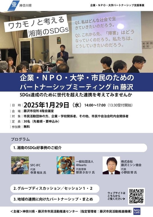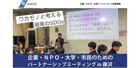 1月29日(水)に、企業・NPO・大学・市民のためのパートナーシップミーティング in 藤沢 ワカモノと考える湘南のSDGs(主催:神奈川県・藤沢市市民活動推進センター)開催!ご参加お待ちしております