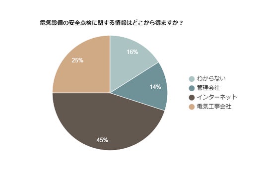 電気設備の安全点検に関する情報収集方法についてアンケートを行ったところ、45%の人が「インターネット」を、25%の人が「電気工事会社」を主な情報源として挙げました。