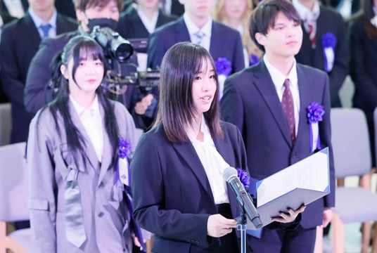 続いて、新入生を代表し、川手知拓さん、山下瑞季さん、天野ひろ香さんが宣誓を行いました。川手さんは「私はZEN大学で、数理科学の学修に尽力したいと思います。数学は世界の根幹を支える知の体系であり、その探究で思考を研ぎ澄ませたいと考えています。そのために、オンラインを活かした『数学の学修会』を創出して仲間とのコミュニティを築くなど、専門性と多様な視点を吸収しながら可能性を切り拓いていきたいと思います」、山下さんは「私はZEN大学で、多角的な視点の獲得と実践的スキルの修得に取り組みたいと思います。イラストやプログラミングなどの実践スキルを磨くことによって日々進化する技術に対応できる創造的なアプローチを身につけ、表現者として新たな可能性を広げたいと思います」、天野さんは「私はZEN大学での学びを通じて、社会課題の解決に挑戦します。実際に働く方々に寄り添い、課題を丁寧にヒアリングしながら具体的な解決策を探求します。地域・企業連携プログラムに参加し、効率化と同時に仕事の魅力を広められる人材になりたいと思います」と、それぞれ抱負を語りました。