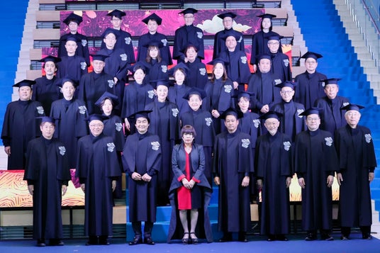 アカデミックガウンを着用した教職員と、デザイナーのコシノジュンコ氏(最前列中央)