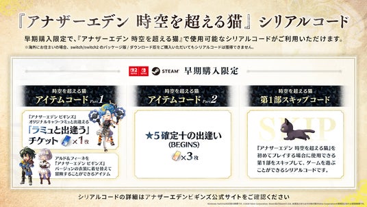 さらに、全エディションに早期購入で『アナザーエデン 時空を超える猫』で使用できるシリアルコードが付属します。