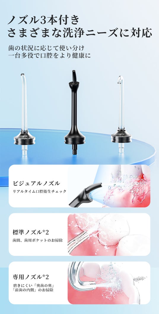 各ノズルは特定の清掃ニーズに応じて設計されており、適切なノズルの使用で洗浄効果を向上させ、口腔衛生を効果的に保つことができます。