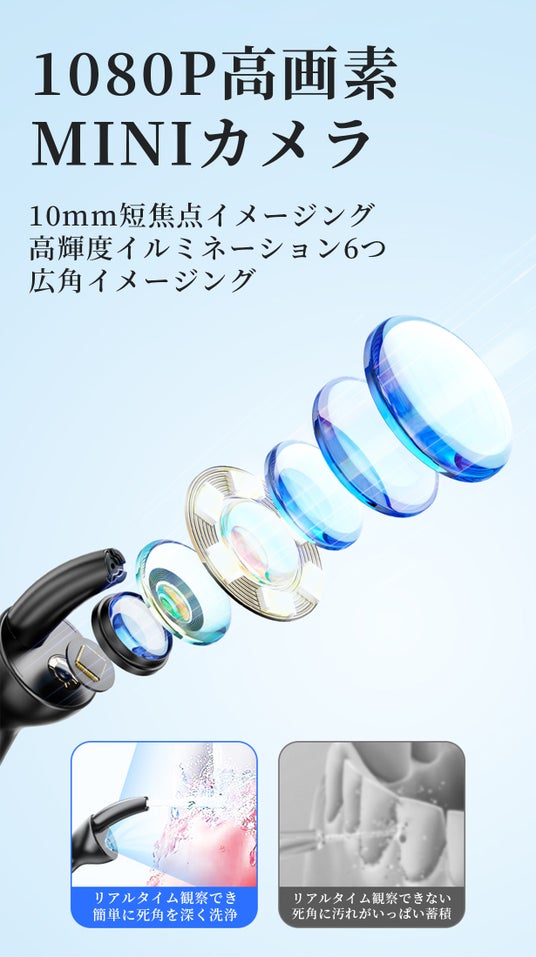 1080P高画素カメラ付き、高輝度イルミネーションが6つあり、歯の汚れ等その他の口腔内の問題がないか確認できます。
