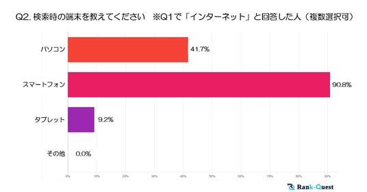 最も多かった回答は「スマートフォン」で、全体の90.8%が検索時に利用していると回答しました。次いで「パソコン」が41.7%、「タブレット」は9.2%と少数派にとどまりました。
