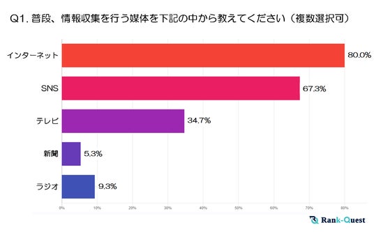 最も多かった回答は「インターネット」で、全体の80%が利用していると回答しました。次いで「SNS」が67.3%と高い割合を占め、デジタル媒体が主な情報収集手段であることがわかります。