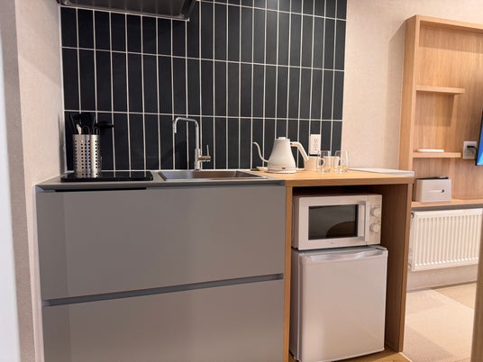 シンプルで機能的なキッチン。長期滞在にも対応し、快適な滞在をサポート