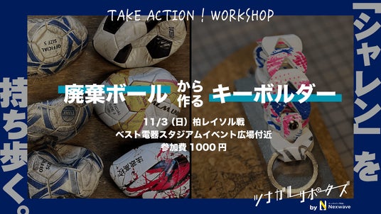ワークショップでは、廃棄サッカーボールからできたパーツで作るキーホルダー「Keyballder(キーボルダー)」の制作体験をおこないました。今回パーツ作成に使用した廃棄サッカーボールは全てアビスパ福岡のファン・サポーターの皆さまから集めたものであり、総勢22の個人・団体の皆さまがボールの寄付にご協力くださりました。