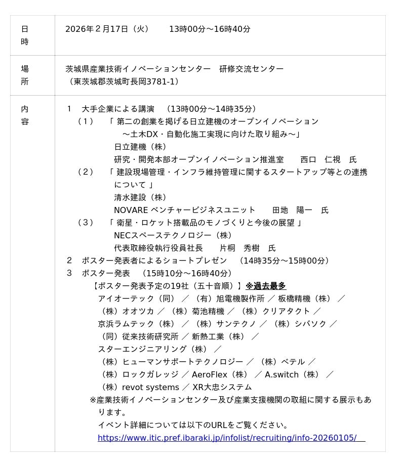 当日は、大手企業3社(日立建機株式会社、清水建設株式会社、NECスペーステクノロジー株式会社)のニーズに関する講演の後、その大手企業に対して中小企業が自社の技術シーズ等のポスター発表を行います。