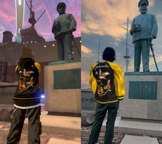 メタバースヨコスカ(写真左)と実際の神奈川県横須賀市(写真右)での記念撮影の様子