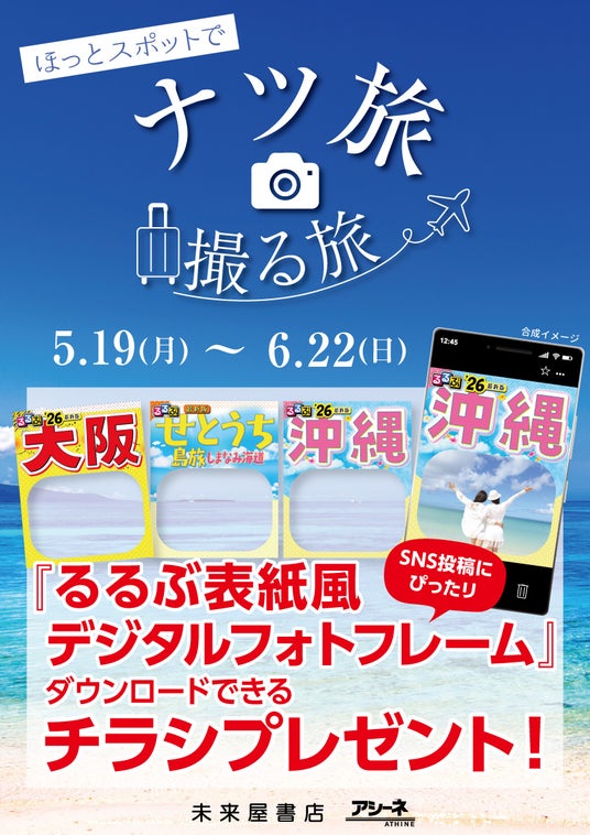株式会社未来屋書店(本社:千葉市美浜区、代表取締役社長:平川雅隆、以下 未来屋書店)は、2025年5月19日より株式会社JTBパブリッシング(東京都江東区 代表取締役 社長執行役員:盛崎宏行)とコラボした特別企画「ほっとスポットでナツ旅・撮る旅キャンペーン」を開始します。