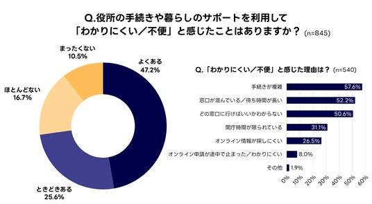 さらに、自治体サービス利用者のうち約6割(63.9%)が「わかりにくい/不便」と感じたことがあると回答しました。その理由は「手続きが複雑」「窓口が混んでいる/待ち時間が長い」「どの窓口に行けばよいかわからない」が上位3項目に挙げられました。これらは、デジタル化やAI活用による改善が期待される領域と重なっています。