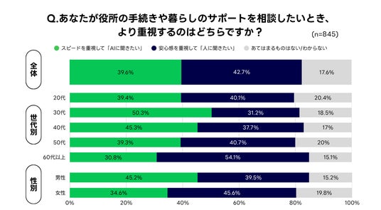 また、自治体サービスの相談時に、「スピードを重視して“AIに聞きたい”」か「安心感を重視して“人に聞きたい”」かを尋ねた質問では、「AI派」が39.6%、「人派」が42.7%と拮抗しました。