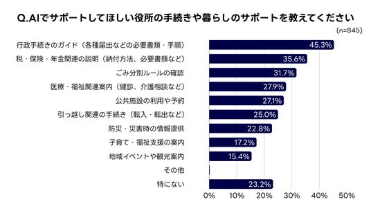 とりわけ期待の高い分野は「役所の手続きのガイド(45.3%)」が最多で、「税・保険・年金関連の説明(35.6%)」「ごみ分別ルールの確認(31.7%)」が続きました。
