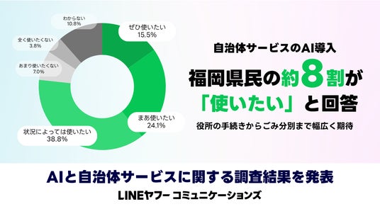 LINEヤフーコミュニケーションズ株式会社(本社:福岡市博多区、以下 当社)は、福岡県民845名を対象に「AIと自治体サービスに関する意識調査」を実施しました。当社は、自治体・企業・市民と共に街の課題を解決するスマートシティプロジェクト「LINE SMART CITY」を推進しています。本調査はその一環として、生成AIの急速な普及を背景に、役所の手続きや日常生活に身近なサービスにおいて、県民がAI導入をどのように受け止め、どの分野に期待しているのかを明らかにすることを目的に行いました。