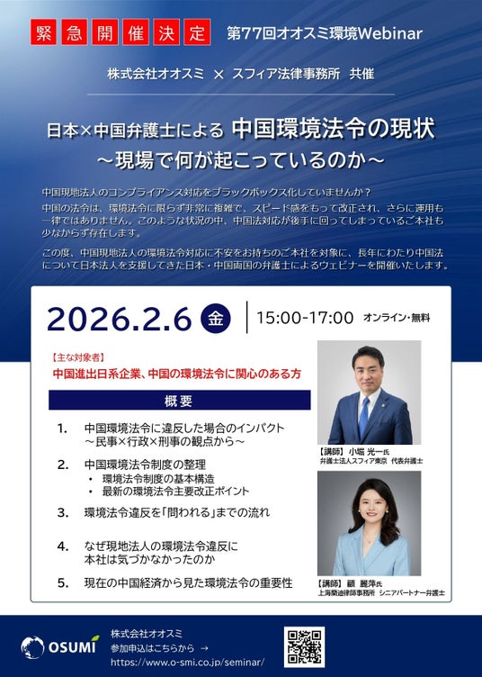 弁護士法人スフィア東京(本社:東京都港区、代表弁護士:小堀光一、以下「当事務所」)は、2026年2月6日(金)に株式会社オオスミ(本社:神奈川県横浜市、代表取締役:大角武志)とウェビナー「日本×中国弁護士による 中国環境法令の現状 ~現場で何が起こっているのか~」を共催し、当事務所代表の小堀光一が講師として登壇いたしました。