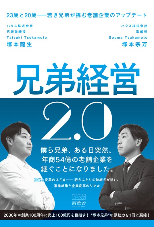 建設・不動産業のハタス株式会社(愛知県刈谷市、代表取締役社長:塚本龍生)は、代表取締役社長の塚本龍生(25歳)と取締役の塚本宗万(22歳)による共著書籍『兄弟経営2.0 -23歳と20歳-若き兄弟が挑む老舗企業のアップデート-』を2025年11月30日に発売いたします。現在Amazonにて予約受付中です。本書は、創業95年・年商54億円の老舗企業を、突然の事業継承で引き継いだ若き兄弟経営者の2年間の軌跡を赤裸々に綴った経営実録書です。