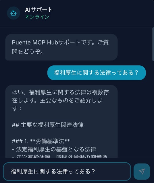 Puente MCP Hub内のAIサポートは、単なるFAQチャットボットではなく、AIエージェントとして実装されています。