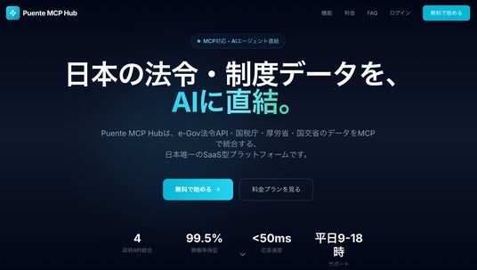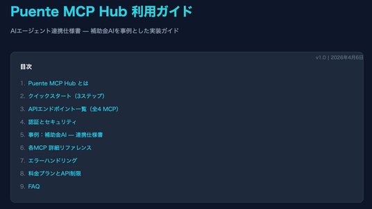 株式会社プエンテ(本社:埼玉県所沢市、代表取締役:保科一男)は、日本の公的APIをAnthropicのModel Context Protocol(MCP)対応のSaaSプラットフォームとして提供する「Puente MCP Hub」(https://puentemcp.com)を2026年4月8日より正式提供開始いたしました。