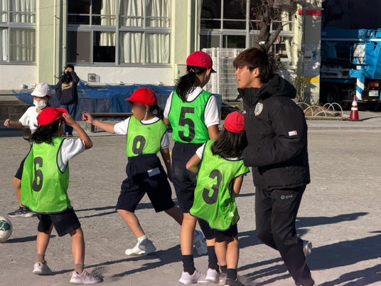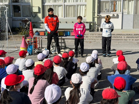 2025年12月12日(金)、江戸川区立篠崎第4小学校にて、南葛SC選手の中村洸太、福本悠、南葛SC WINGSから菅野永遠、WINGSアカデミーの永木真理子監督が、小学4年生、4クラス100名を対象にサッカー教室「翼DREAM(つばさドリーム)」を行いました。